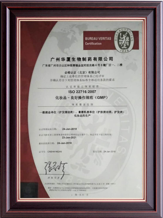 公司始創(chuàng)建于2012年,經(jīng)過八年的健康發(fā)展,已經(jīng)成為可以從事妝字號(hào)、消字號(hào)、械字號(hào)等系列產(chǎn)品生產(chǎn)加工的大型企業(yè)。企業(yè)坐落在美麗的廣州白云區(qū)鐘樓潭鎮(zhèn),擁有面積超過15,000平方米的生產(chǎn)廠房。廠房寬敞明亮,設(shè)計(jì)科學(xué)新進(jìn),擁有十萬級(jí)的生產(chǎn)車間,局部環(huán)境可以達(dá)到一萬級(jí)別;設(shè)備多采用新進(jìn)的進(jìn)口設(shè)備,自動(dòng)化程度非常高,擁有一流的生產(chǎn)設(shè)施。工廠同時(shí)通過了ISO22716和GMCP質(zhì)量管理認(rèn)證,擁有一流的質(zhì)量管理體系。廠